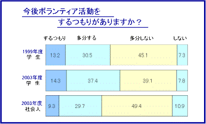 今後あなたは、慈善団体などでボランティア活動をするつもりがありますか? ● する・・・ 1999年学生.........44% 2003年学生.........52% 2003年社会人.....39% ● しない・・・ 1999年学生.........52% 2003年学生.........47% 2003年社会人.....60% |