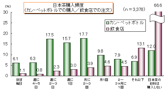 ●日本茶(飲料)について、”カン・ペットボトルでの購入”及び”飲食店の注文”についてそれぞれ頻度を尋ねたところ、カン・ペットボトルの購入頻度は「週に2〜3日」から「月に2〜3回」が多い。 ●飲食店での注文頻度は「日本茶の飲料は購入しない」が67%に達する。 |