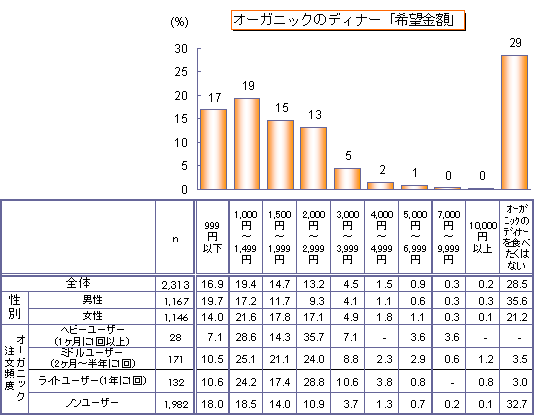●ディナーでの希望金額は、「1,000〜1,499円」が最も多く19%、次いで「999円以下」(17%)、「1,500〜1,999円」(15%)と続き、「2,000円以下」で51%と半数に達する。 ●オーガニック注文頻度別では、ヘビーユーザーで「2,000〜2,999円」が最も高く36%であった。 |